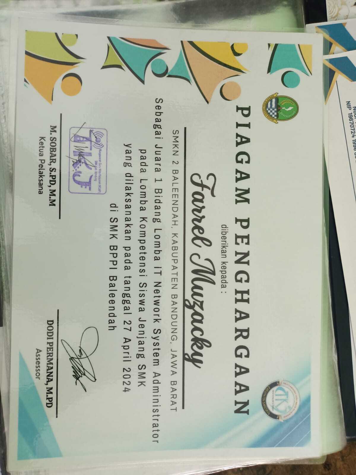 Juara 1 Bidang Lomba IT Network System Administrator pada Lomba Kompetensi Siswa jenjang SMK yang dilaksanakan Pada tanggal 27 April 2024 di SMK BPPI Baleendah.